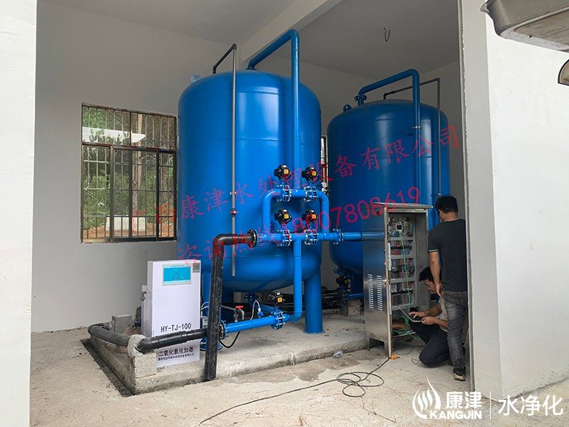 工藝流程:山泉水-二氧化氯加藥器-絮凝投加器-石英砂過濾器-用水點