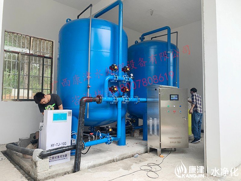 工藝流程:山泉水-絮凝投加器-石英砂過濾器-二氧化氯加藥器-用水點