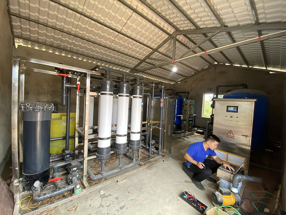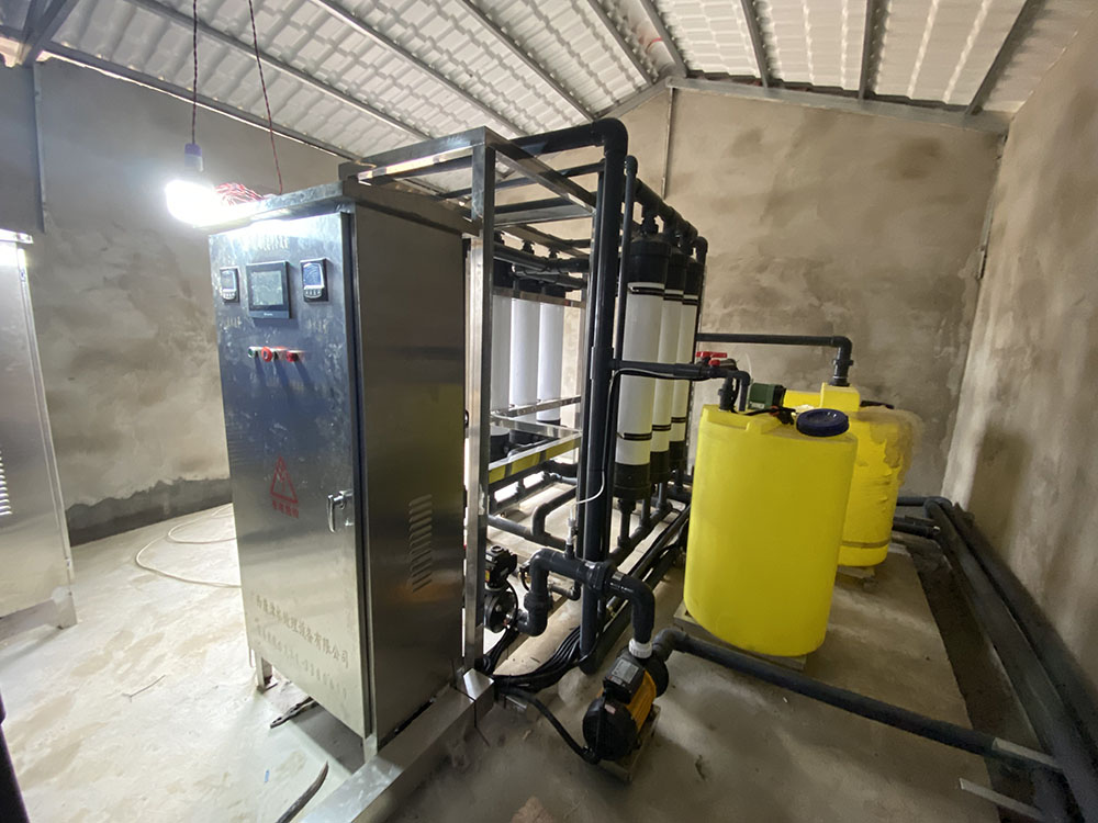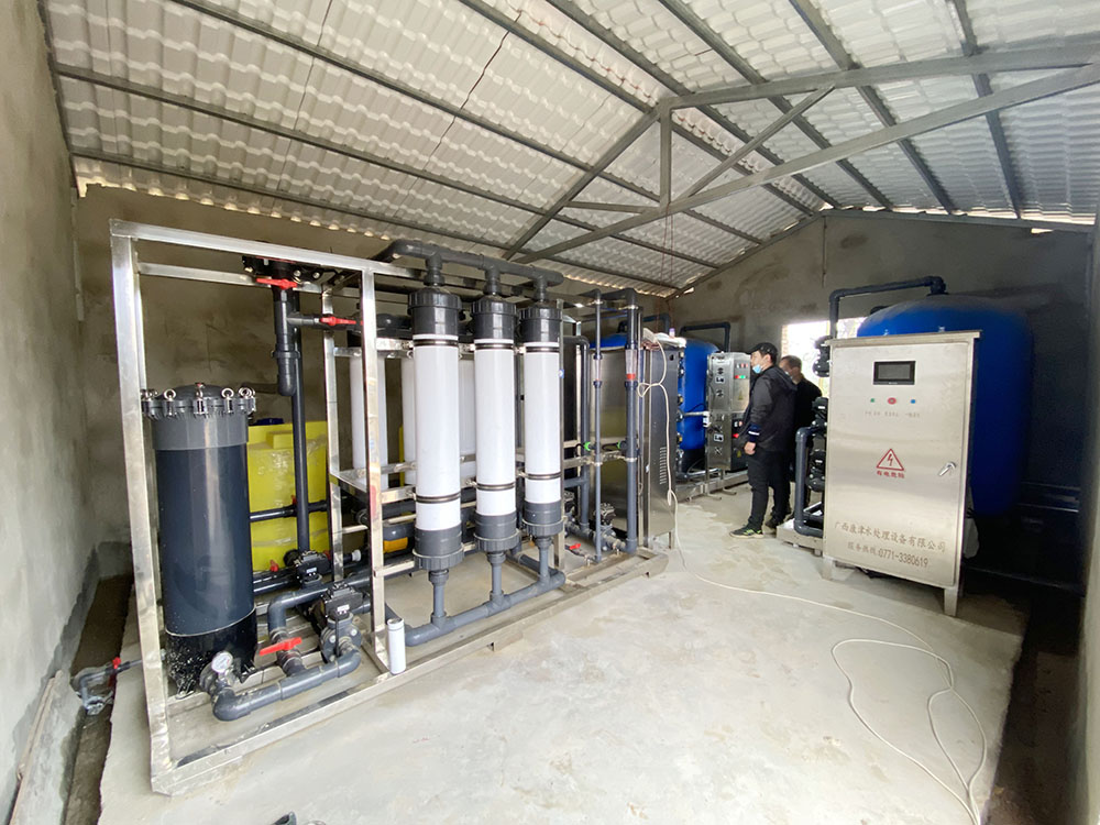 本方案主要針對原水為河水,以河水為飲用水源的地區,常常在雨季會遇到水質渾濁發黃問題。河水通常比較渾濁,水面漂浮臟東西、樹葉、水藻等,尤其在暴雨季節,水中泥沙量增加,雜質多,濁度、色度、氣味、細菌含量超標,因此必須使用專業凈水設備處理后才能達到生活飲用的目的。我們對河水的凈化主要是除去水中雜質,包括以下幾種:泥沙、大分子顆粒雜質、懸浮物、藻類、膠體,去除污染色度、異味、微生物、細菌、病毒等,有的源水會含有HCO、Ca 、SO 、Cl 、Na 、Mg 和K。為了將河水指標達到生活用水標準,通過康津超濾設備進而得到凈化。康津水處理為根據實際用途情況制定以下解決方案。用水人數大約在100至200人,用水處理量每小時約8噸。