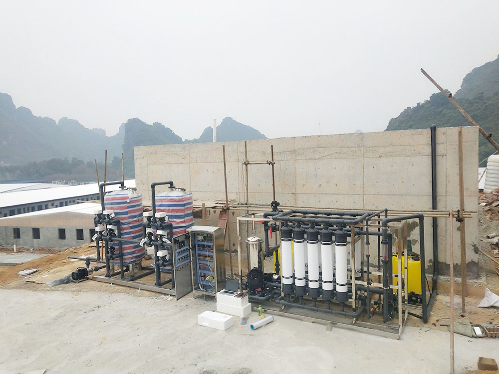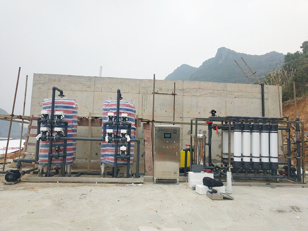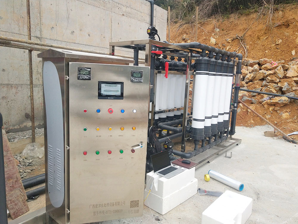 本方案主要針對原水為河水,以河水為飲用水源的地區,常常在雨季會遇到水質渾濁發黃問題。河水通常比較渾濁,水面漂浮臟東西、樹葉、水藻等,尤其在暴雨季節,水中泥沙量增加,雜質多,濁度、色度、氣味、細菌含量超標,因此必須使用專業凈水設備處理后才能達到生活飲用的目的。我們對河水的凈化主要是除去水中雜質,包括以下幾種:泥沙、大分子顆粒雜質、懸浮物、藻類、膠體,去除污染色度、異味、微生物、細菌、病毒等,有的源水會含有HCO、Ca 、SO 、Cl 、Na 、Mg 和K。為了將河水指標達到生活用水標準,通過康津超濾設備進而得到凈化。康津水處理為根據實際用途情況制定以下解決方案。用水人數大約在200至300人,用水處理量每小時約10-12噸。