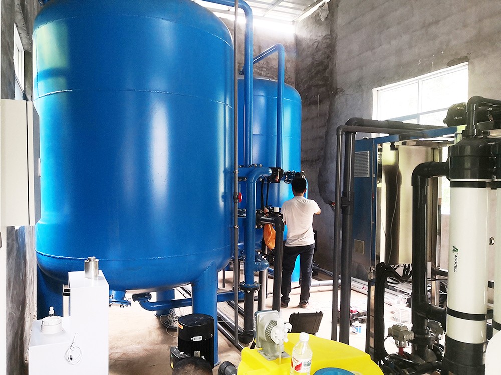 本方案主要針對原水為河水,以河水為飲用水源的地區,常常在雨季會遇到水質渾濁發黃問題。河水通常比較渾濁,水面漂浮臟東西、樹葉、水藻等,尤其在暴雨季節,水中泥沙量增加,雜質多,濁度、色度、氣味、細菌含量超標,因此必須使用專業凈水設備處理后才能達到生活飲用的目的。我們對河水的凈化主要是除去水中雜質,包括以下幾種:泥沙、大分子顆粒雜質、懸浮物、藻類、膠體,去除污染色度、異味、微生物、細菌、病毒等,有的源水會含有HCO、Ca 、SO 、Cl 、Na 、Mg 和K。為了將河水指標達到生活用水標準,通過康津超濾設備進而得到凈化。康津水處理為根據實際用途情況制定以下解決方案。用水人數大約在400至500人,用水處理量每小時約15-20噸。
