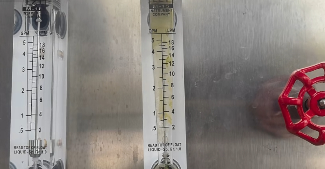 剛到場地后,我們師傅的視線就被流量計給吸引了。通常來說,兩根流量計一個可以看到出水情況一個可以看到進水情況,從外面看,原水流量計已經布滿了黃色水垢,把流量計的軸承拿出,發現上面已經結滿了水垢。師傅打開右邊的閥門后,觀察到流量計上面的壓力表都顯示壓力,在設備的顯示都正常的情況下,出水管卻只有氣流沒有水流,這說明設備的里面的膜很可能都堵死了。大家也可以對比一下自己的反滲透設備,是不是也是出現了以上的情況,如果是的話也有可能是反滲透膜堵塞的原因。