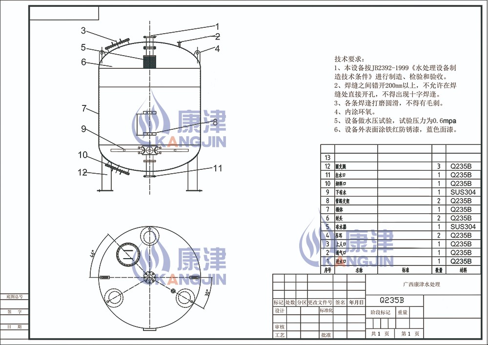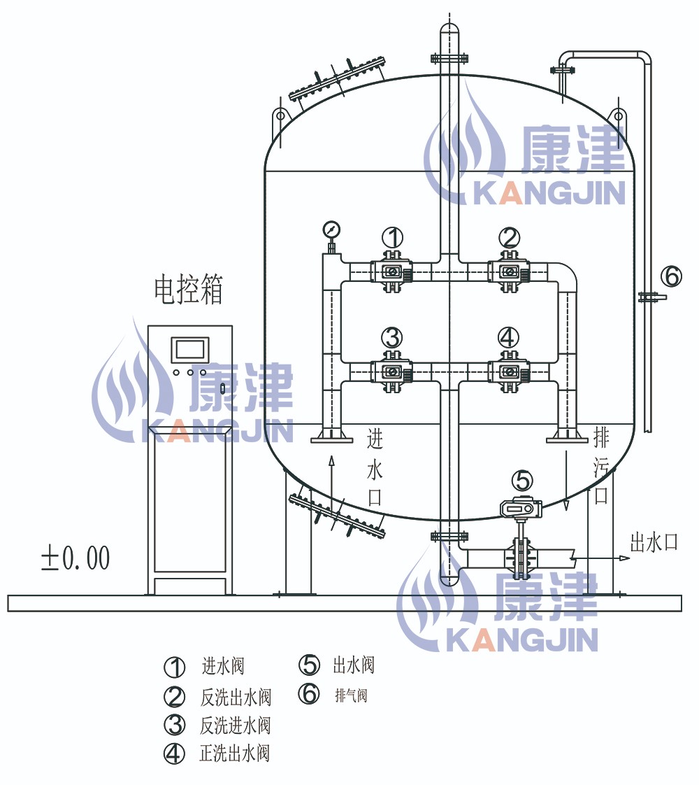 設備主要由罐體、布水系統、集水系統、濾料層、承托層及內部配套管路等組成,外部聯接原水進水、清水出水、反沖洗排水等主要管道和閥門與其相配的控制系統、壓力表、取樣閥等。