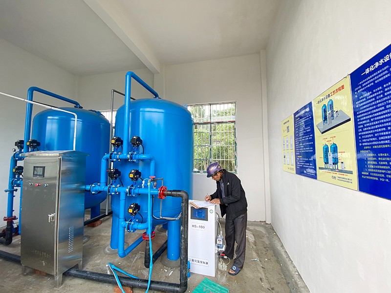 采用化學反應,自動緩釋延時壓力加氯工藝,以含氯75%以上的固體藥劑為主要原料,水與藥劑合理混合后產生的消毒殺菌液,投加到水池、水井、管道和污水池與之接觸達到滅菌的作用。