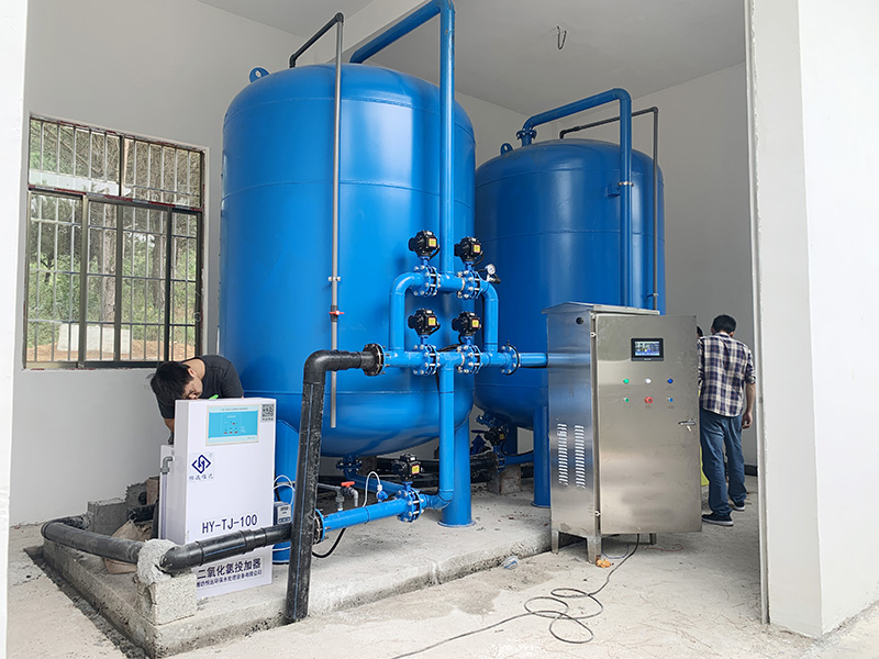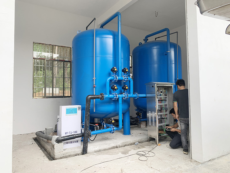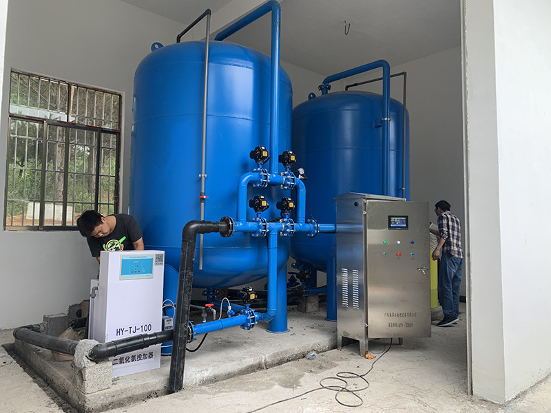 采用化學(xué)反應(yīng),自動(dòng)緩釋延時(shí)壓力加氯工藝,以含氯75%以上的固體藥劑為主要原料,水與藥劑合理混合后產(chǎn)生的消毒殺菌液,投加到水池、水井、管道和污水池與之接觸達(dá)到滅菌的作用。
