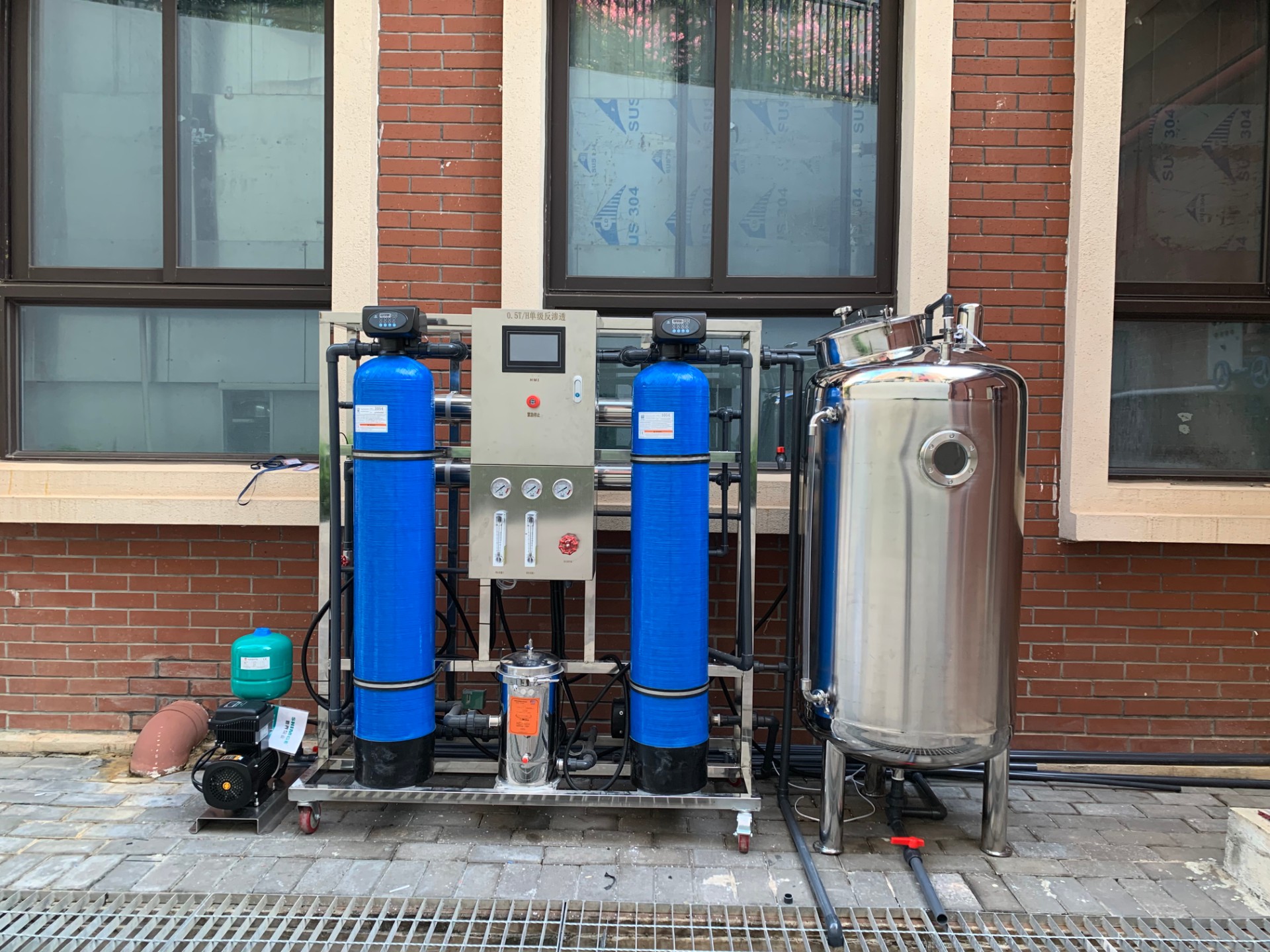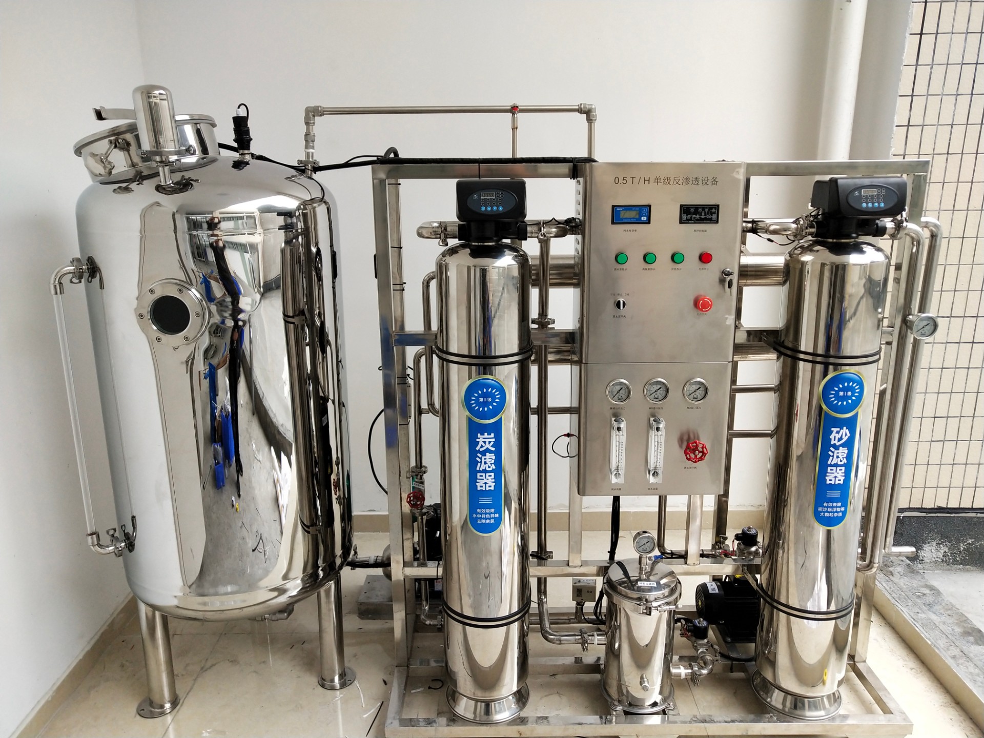 反滲透(RO)系統(tǒng)利用反向自然滲透原理,去除水中的絕大部分溶解鹽類同時(shí)去除一些大分子和預(yù)處理未去除的小顆粒等。反滲透系統(tǒng)包括1臺(tái)5m保安過濾器、1臺(tái)高壓泵、1套R(shí)O膜組、1套阻垢劑投加設(shè)備和1套R(shí)O清洗設(shè)備。RO膜組布置在一個(gè)不銹鋼機(jī)架上。成套設(shè)備本體上有各種閥門和各種顯示儀表,便于用戶現(xiàn)場(chǎng)維護(hù)和監(jiān)控。RO系統(tǒng)水回收率在75%以上,系統(tǒng)一年內(nèi)脫鹽率不小于98%。